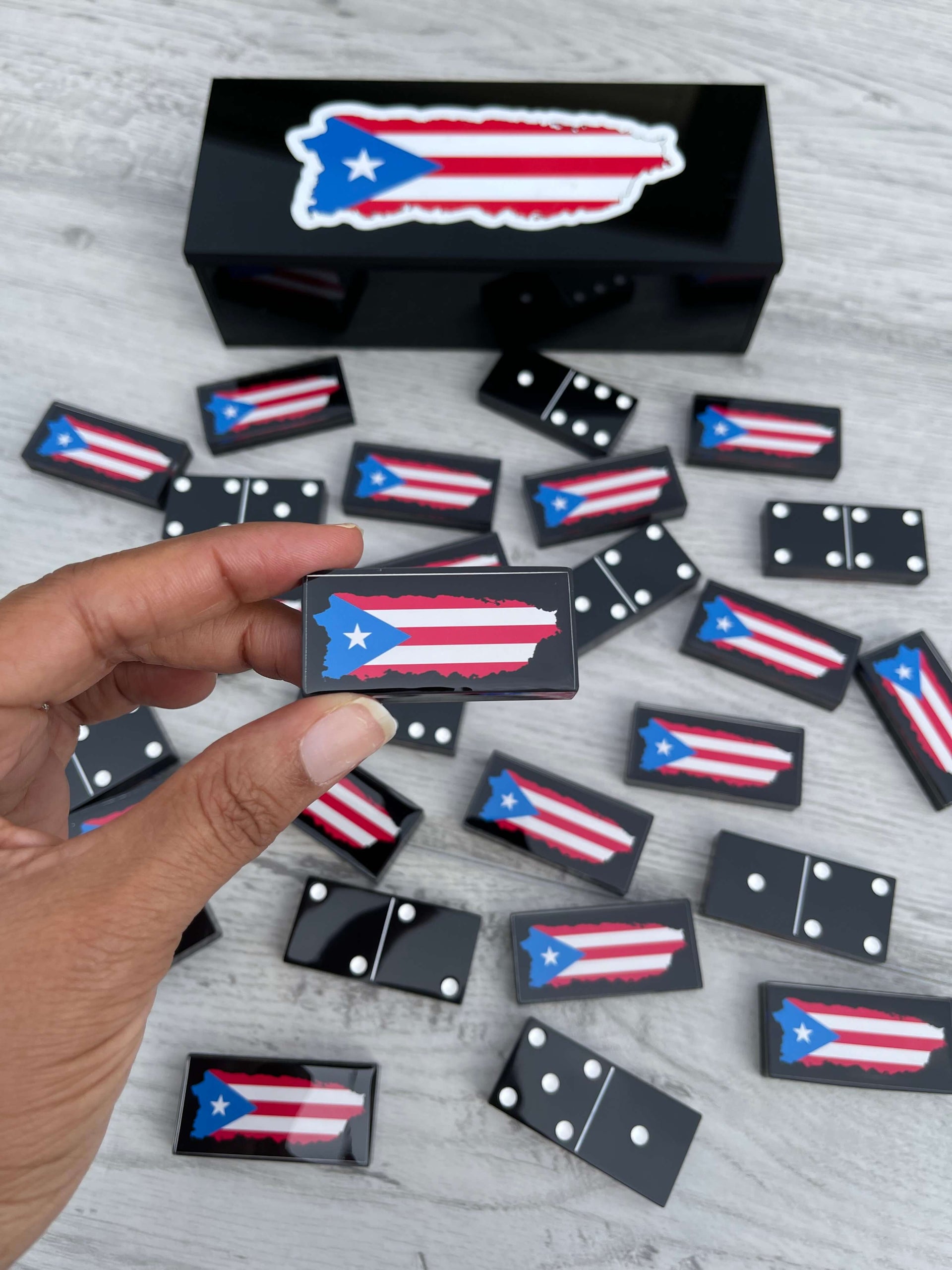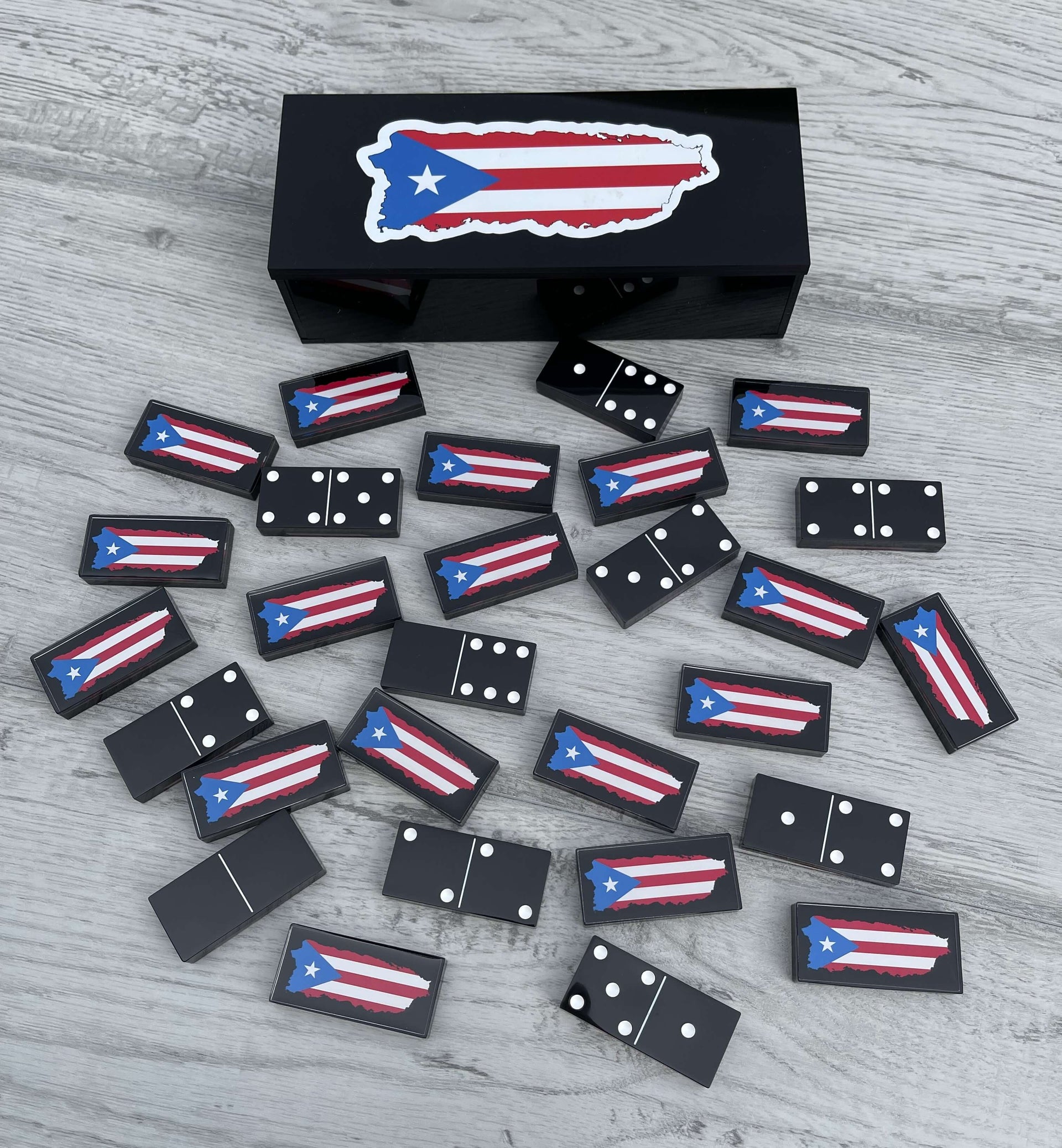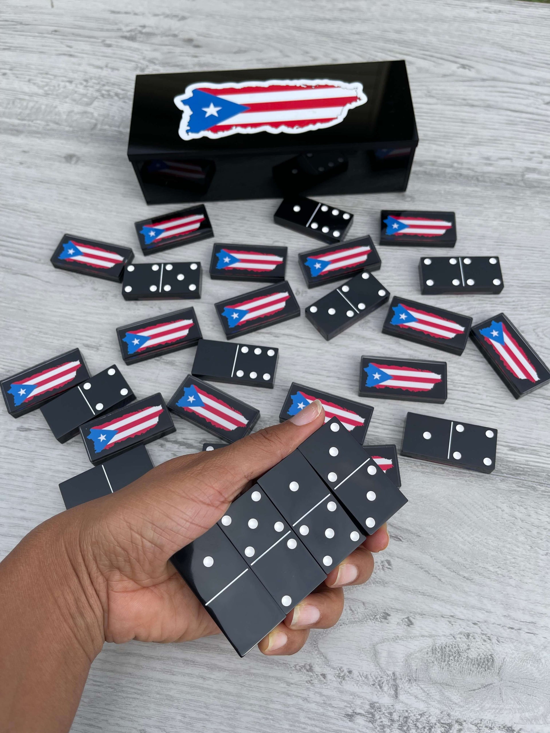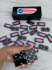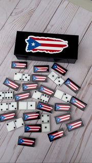 Experience the classic game of dominoes with a unique Puerto Rican twist. This PUERTO RICO Domino Set is expertly handcrafted using quality resin and contains 28 tiles featuring the Puerto Rican map and flag. An ideal gift for family and friends, this set brings a touch of Caribbean fun to game night.