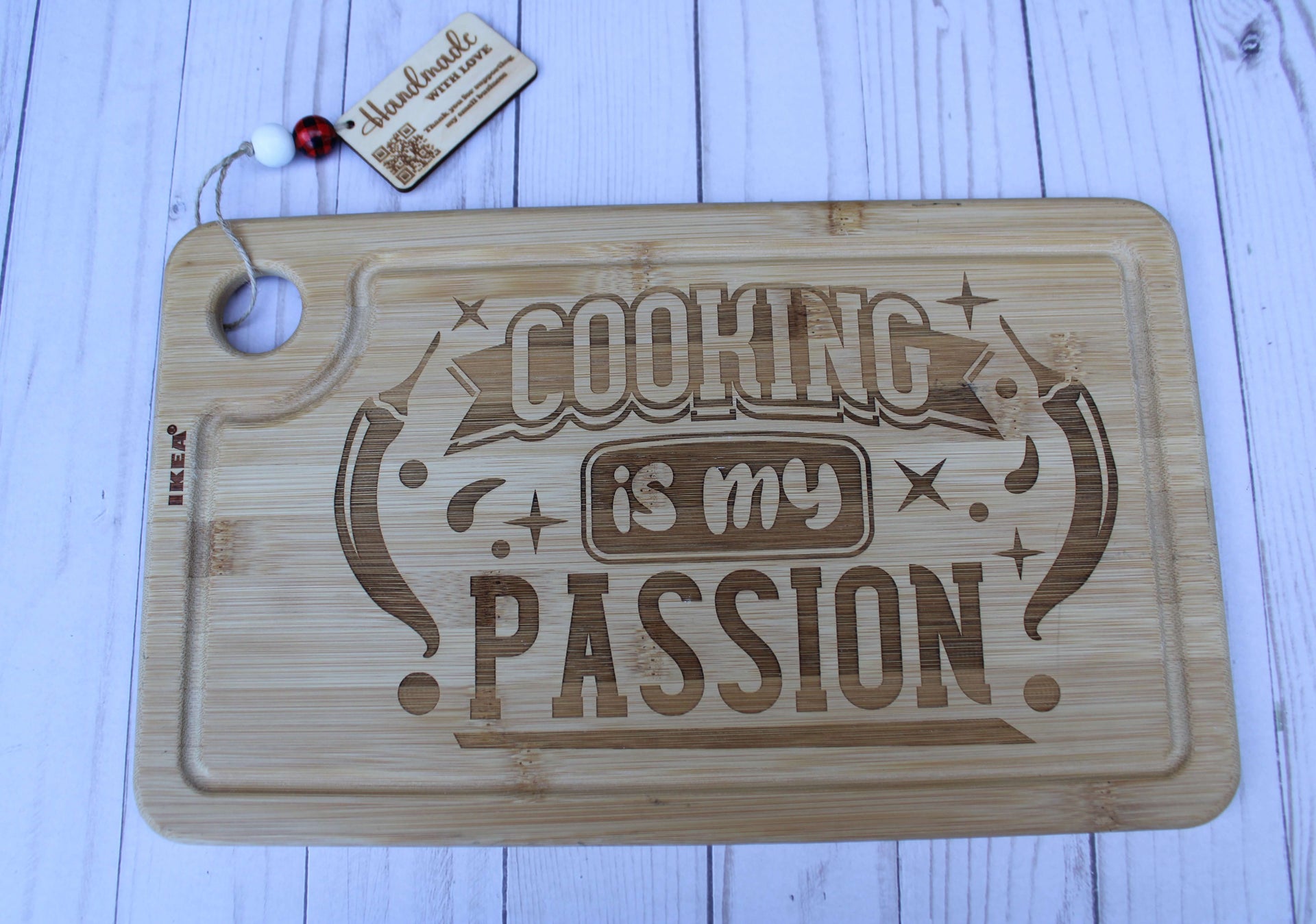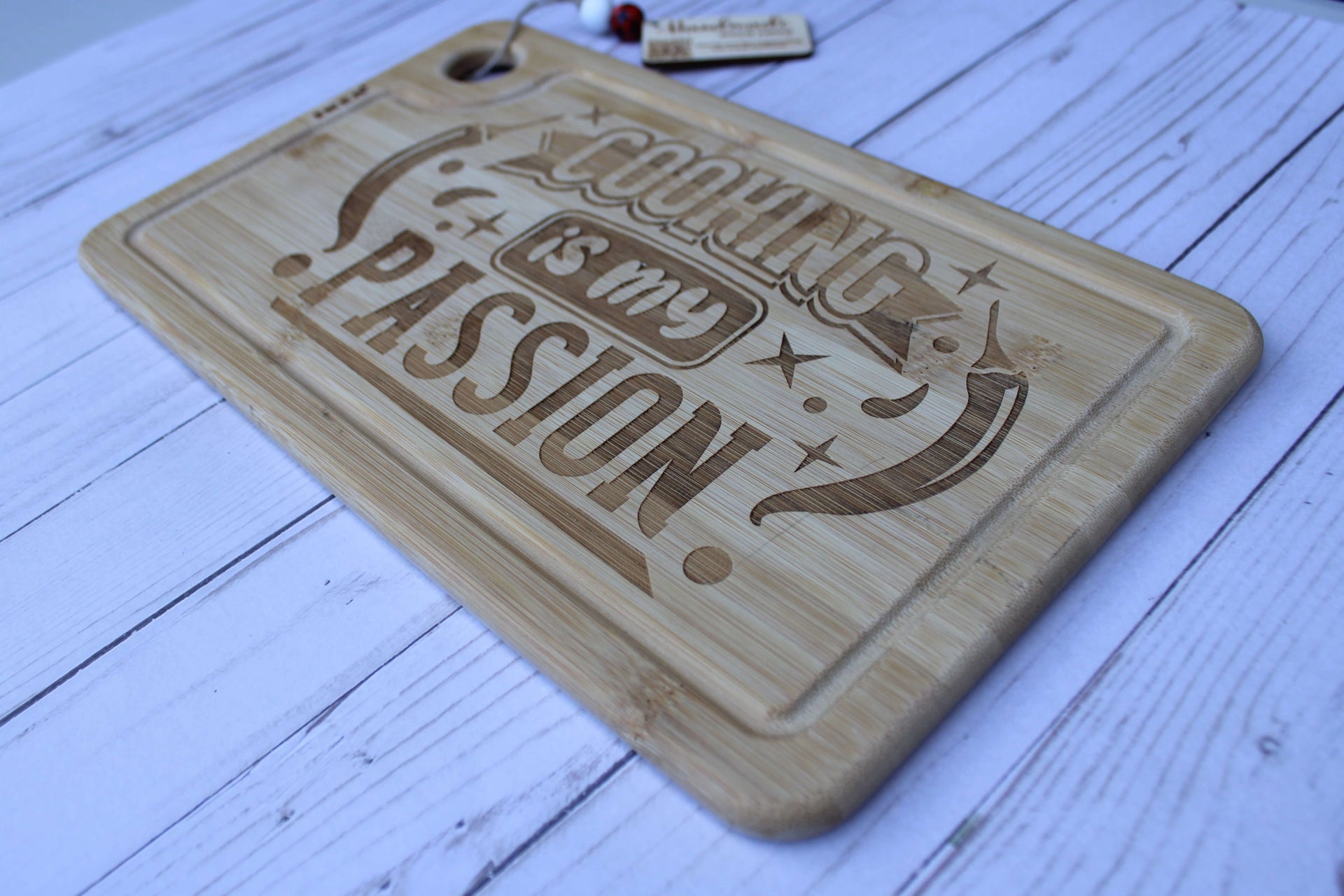 This engraved cutting board is perfect for all your food-prep needs. Made of high-quality bamboo, it's sure to last for years to come. Its curved edges provide an ideal cutting surface with a low chance of slipping, making it safe and comfortable to use. Its iconic "Cooking is my passion" engraving is perfect for anyone with a true culinary spirit. Whether you're hosting a dinner party or slicing up your favorite ingredients, this cutting board is sure to be a hit.