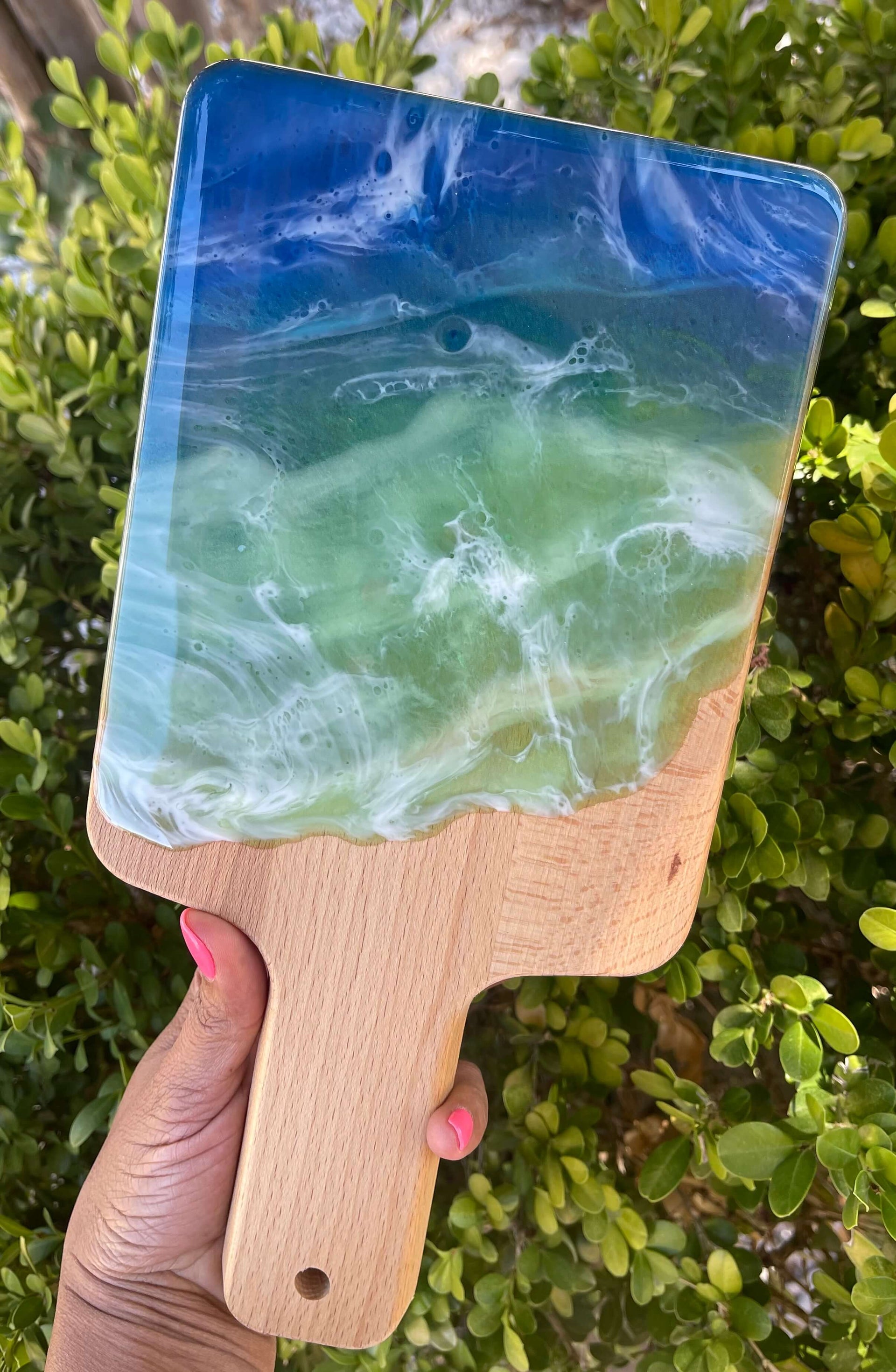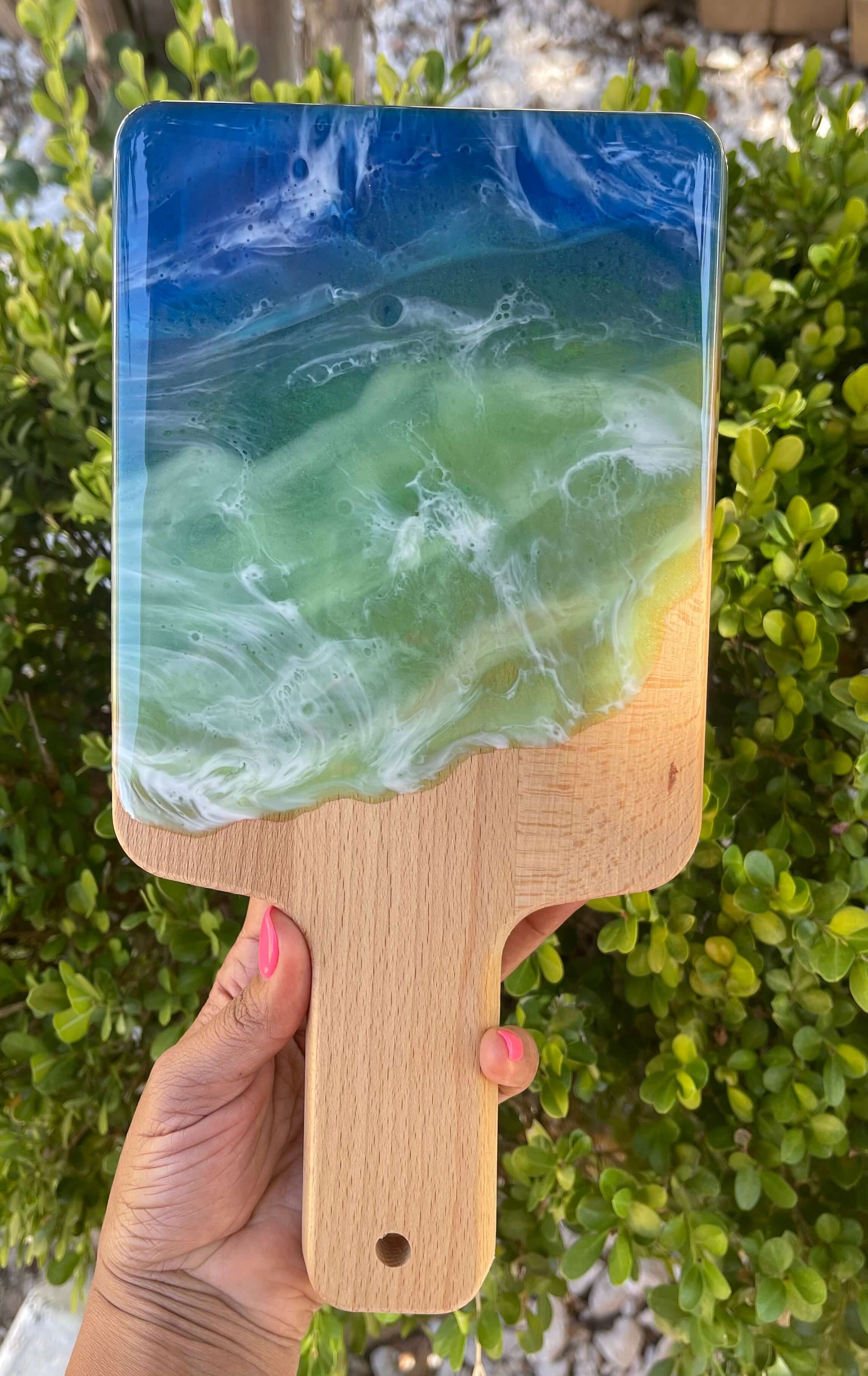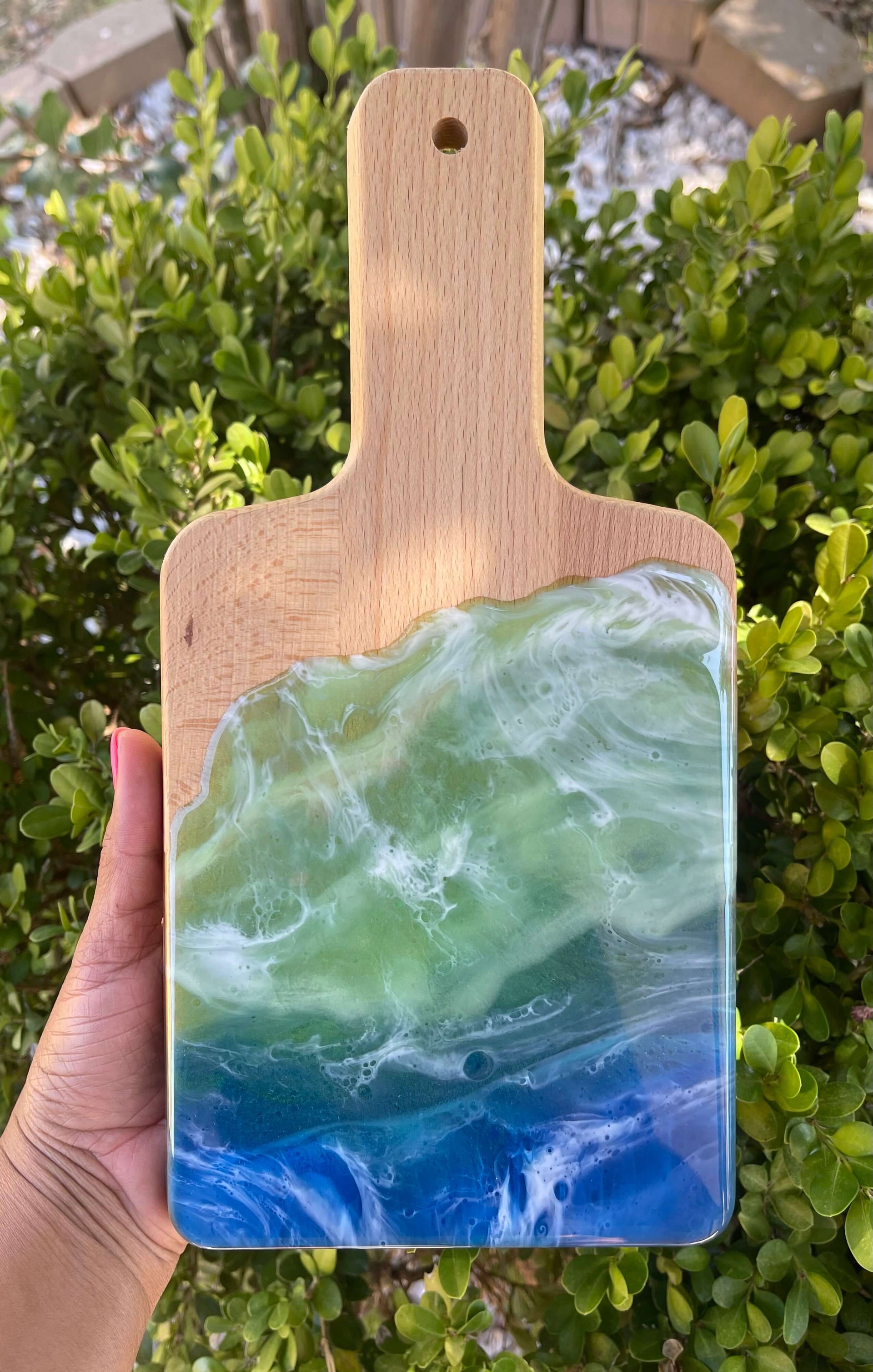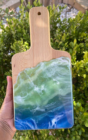 The Ocean Breeze Cutting Board is perfect for both chefs and home cooks, thanks to its lightweight yet durable design. Made from 100% sustainable bamboo decor with Food Safe Epoxy Resin, this cutting board is antimicrobial, heat-resistant, and offers superior knife protection. Its smooth surface and non-slip beveled edges ensure safe and secure slicing.